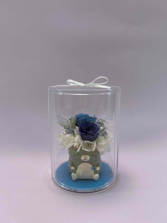 可愛らしい動物がプリザーブドフラワーを載せたアレンジメントシリーズ。青色を纏ったネコが心落ち着く雰囲気を演出します。手のひらサイズでお部屋のインテリアに最適なアイテムです。 ■ カラー/サイズ ・ブルーカラーのプリザーブドフラワーアレンジメント ・ネコ型のレジン製花器 ・高さ:約12cm,直径:約9cm(ケースサイズ) ■ お手入れ/取り扱い注意事項 ・直射日光の当たらない場所で飾ってください。 ・水やりは不要。 ■ 発送・注文に関する情報や注意事項 ・商品の特性上,お客様都合による返品は受け付けておりません。予めご了承ください。 ・ご希望の配送日を指定されない場合,5営業日以内に準備が出来次第発送いたします。 ■ その他の情報や注意事項 ・天然素材を使用したハンドメイド作品です。湿度や温度により色味が変化することがあります。 お問い合せはショップのお問い合わせページからお気軽にどうぞ。