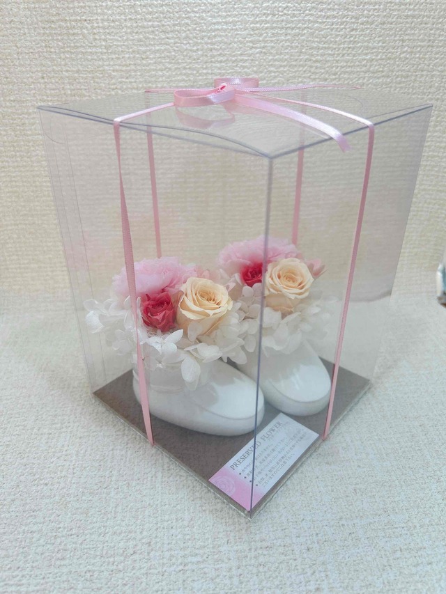 赤ちゃんの誕生を祝うための特別なアレンジメント,ベビーシューズプリザーブドフラワーアレンジメントが登場!可愛らしいベビーシューズをベースに,やわらかい色味のプリザーブドフラワーを使用し,ホッと心和む雰囲気を演出します。ギフトとしてもインテリアとしてもぴったりの一品です。 ■ カラー/サイズ ・パステルカラーのプリザーブドフラワーアレンジメント ・白色のレジン製シューズ ・高さ:約16cm,幅:約12cm,奥行き:約12cm(ケースサイズ) ■ お手入れ/取り扱い注意事項 ・直射日光の当たらない場所で飾ってください。 ・水やりは不要。 ■ 発送・注文に関する情報や注意事項 ・商品の特性上,お客様都合による返品は受け付けておりません。予めご了承ください。 ・ご希望の配送日を指定されない場合,5営業日以内に準備が出来次第発送いたします。 ■ その他の情報や注意事項 ・天然素材を使用したハンドメイド作品です。湿度や温度により色味が変化することがあります。 お問い合せはショップのお問い合わせページからお気軽にどうぞ。