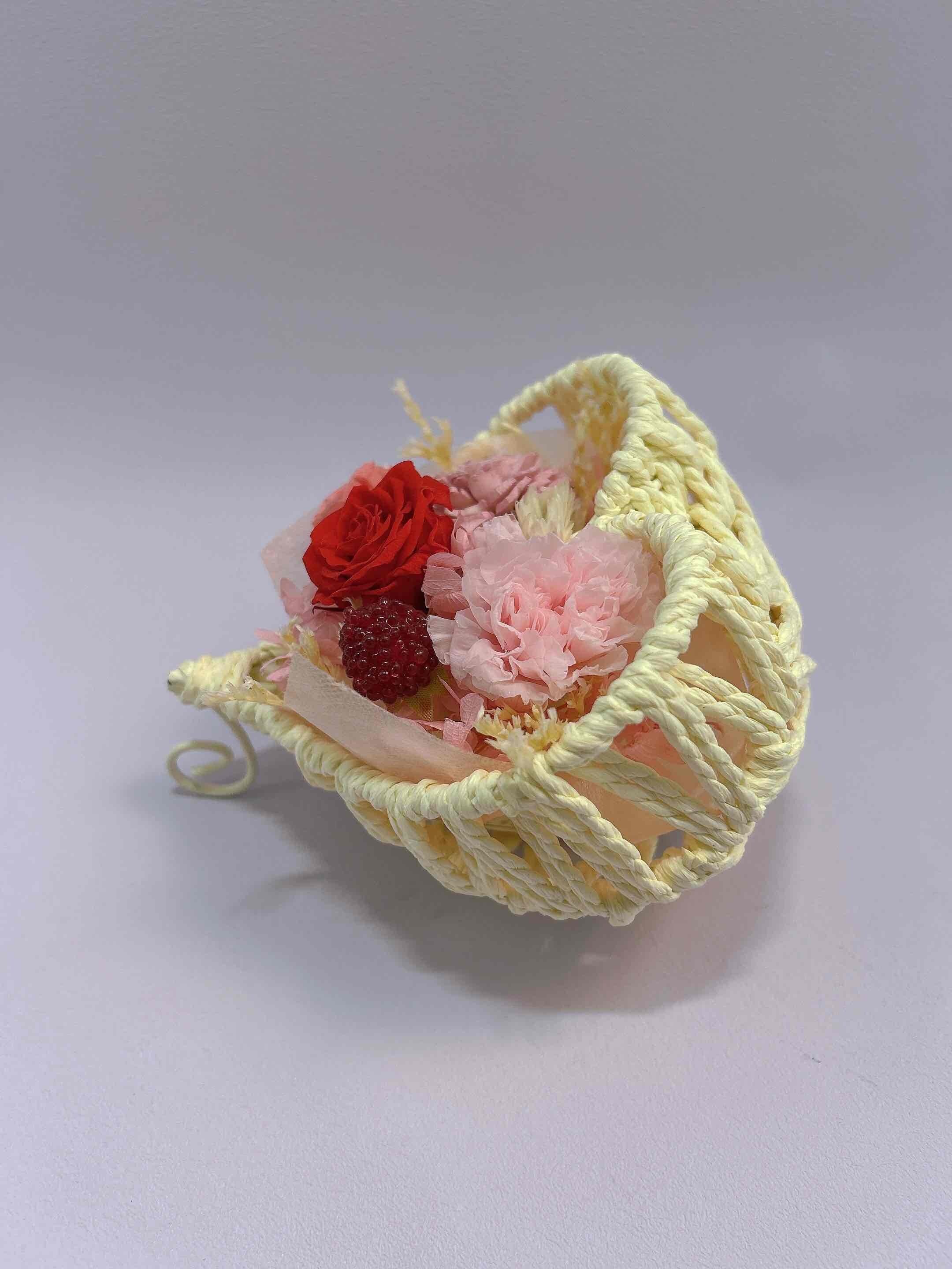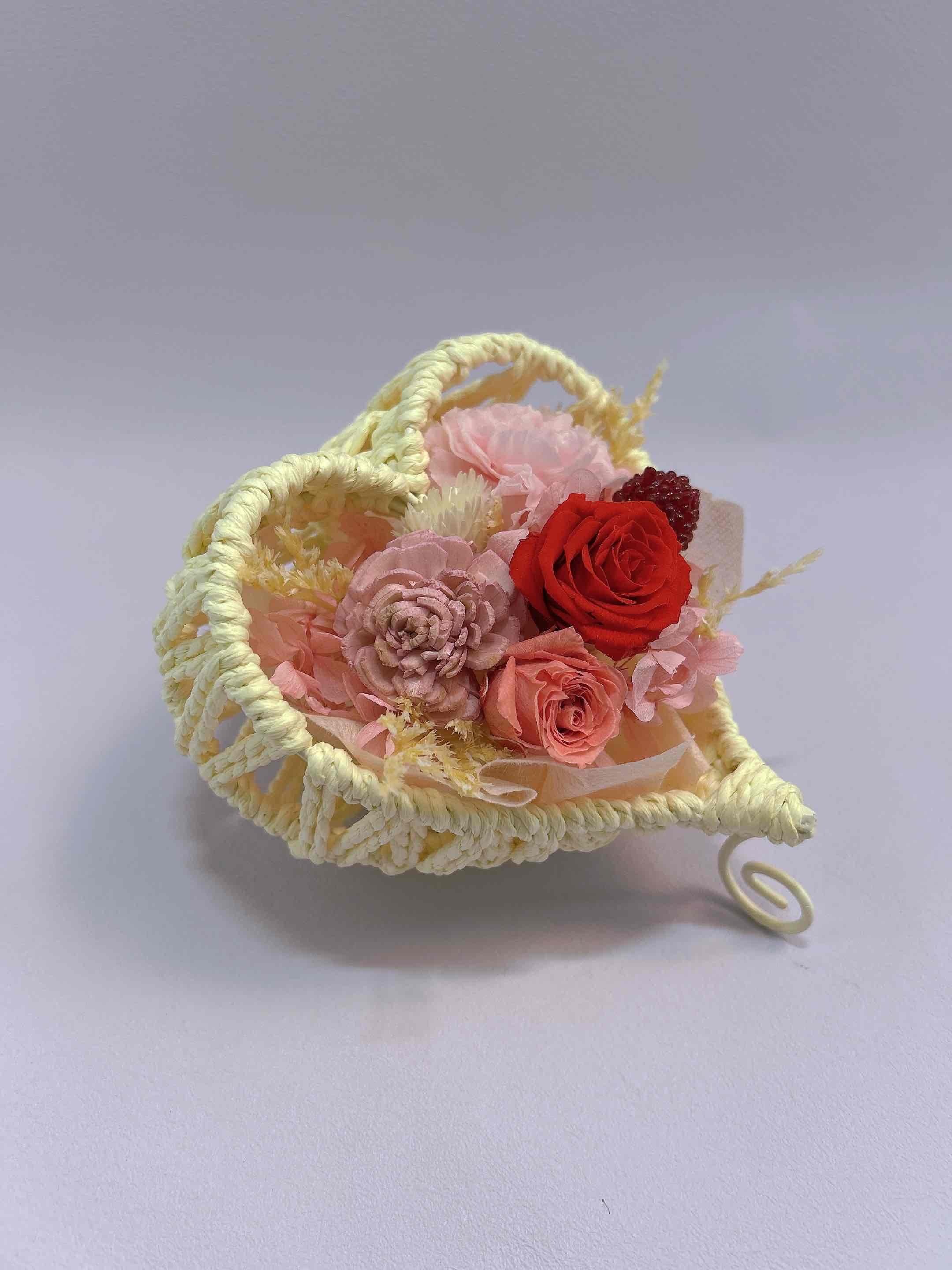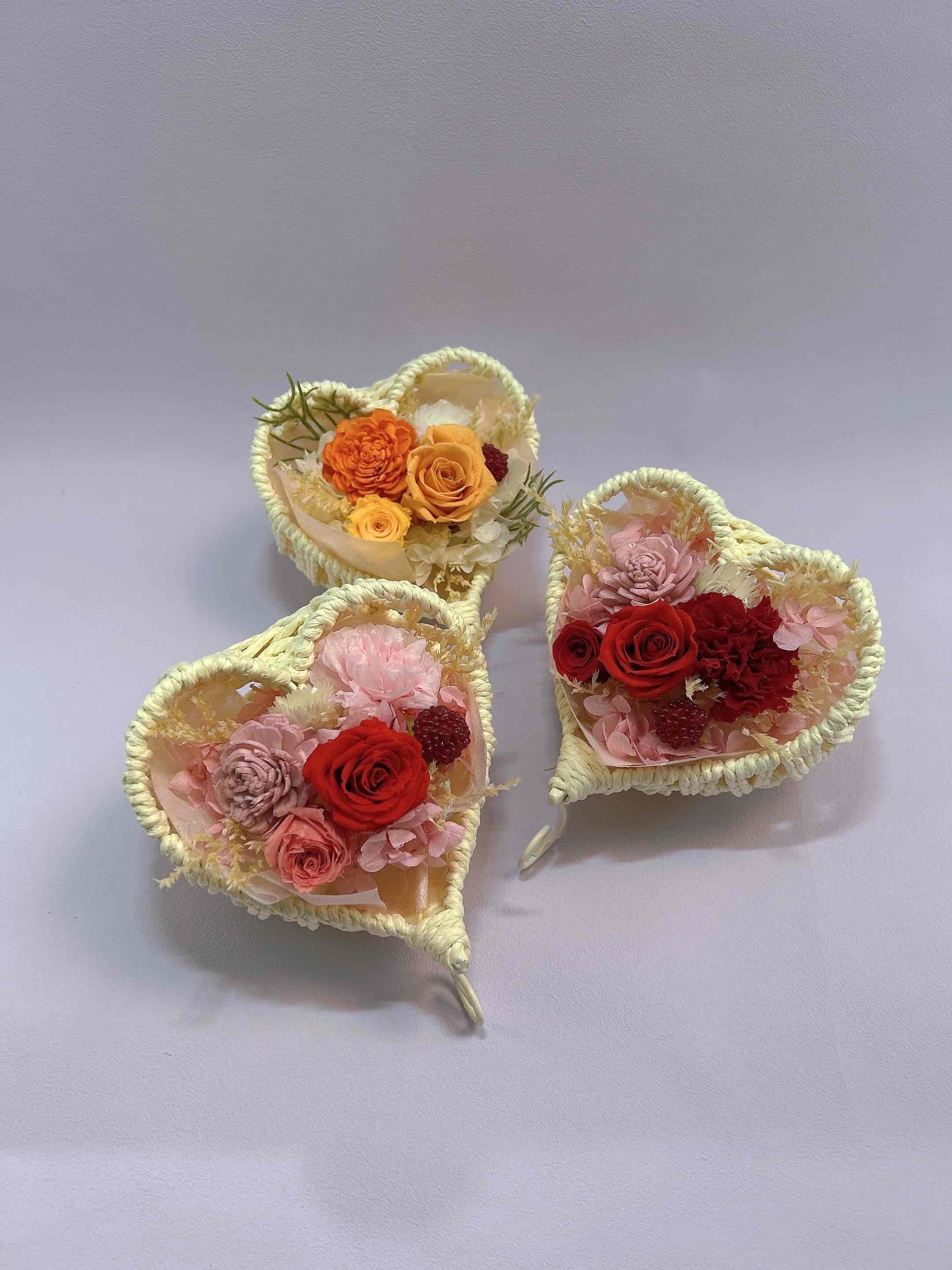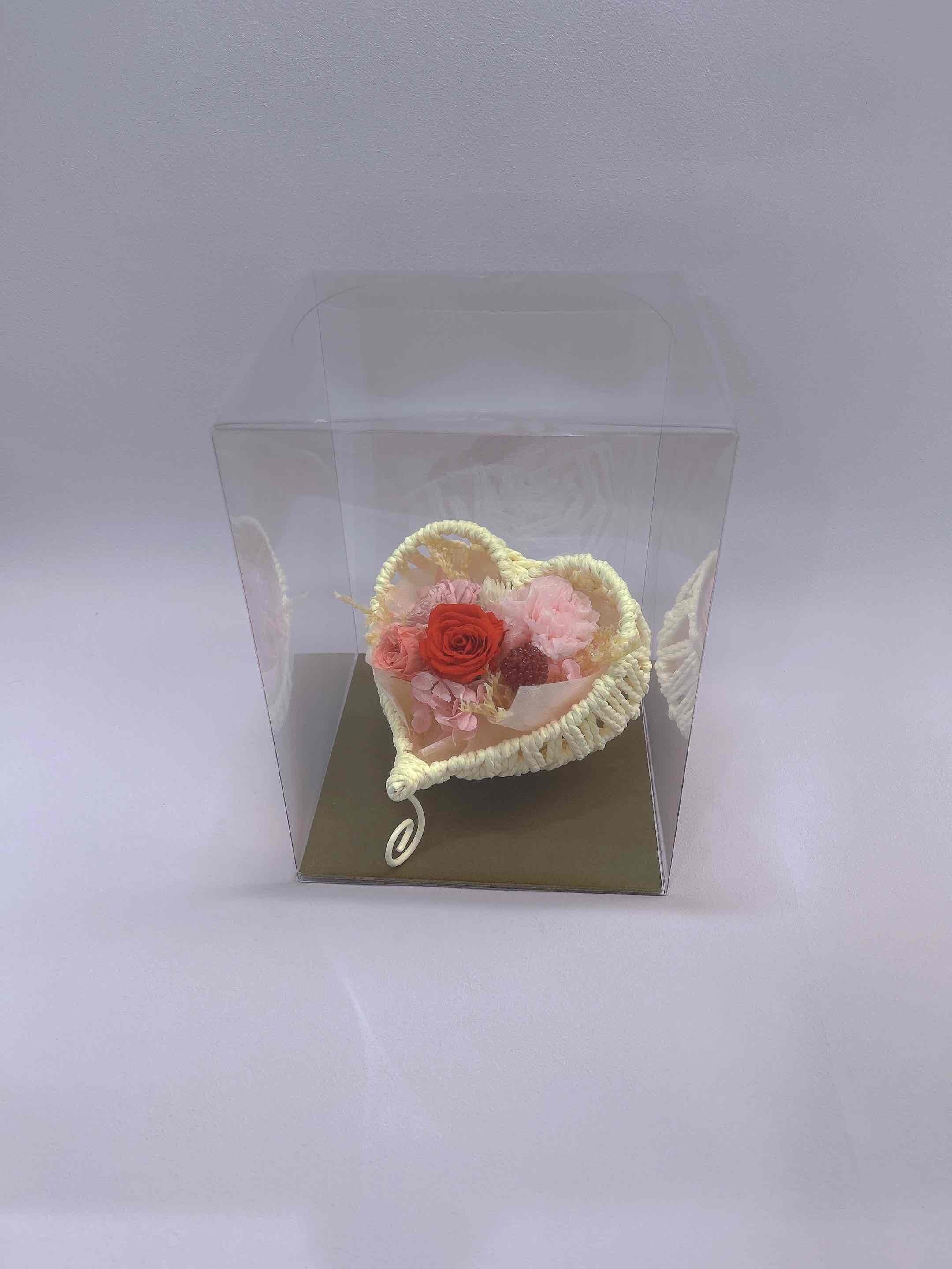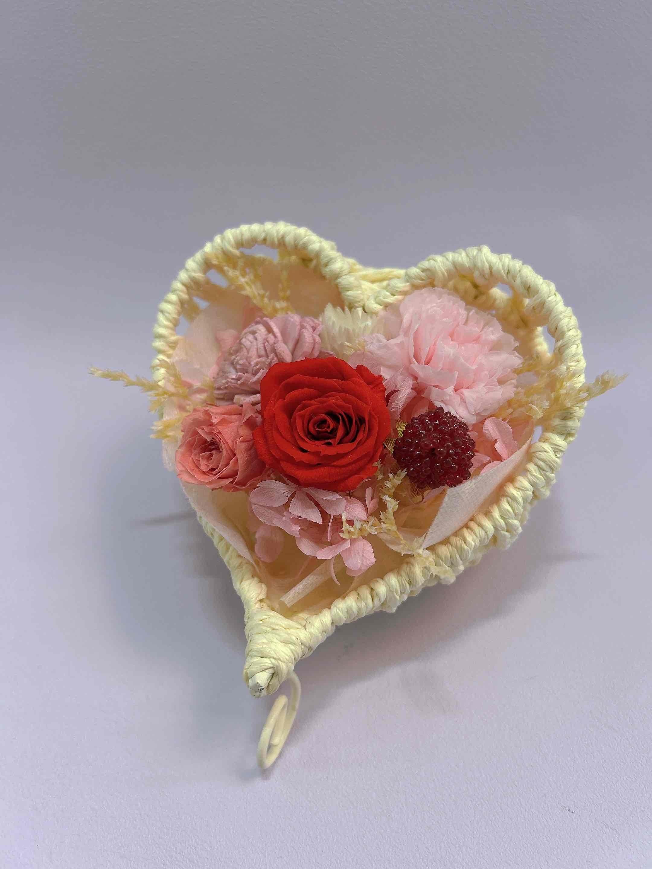 ハート型の器に入った、可愛らしいプリザーブドフラワーのアレンジメント。