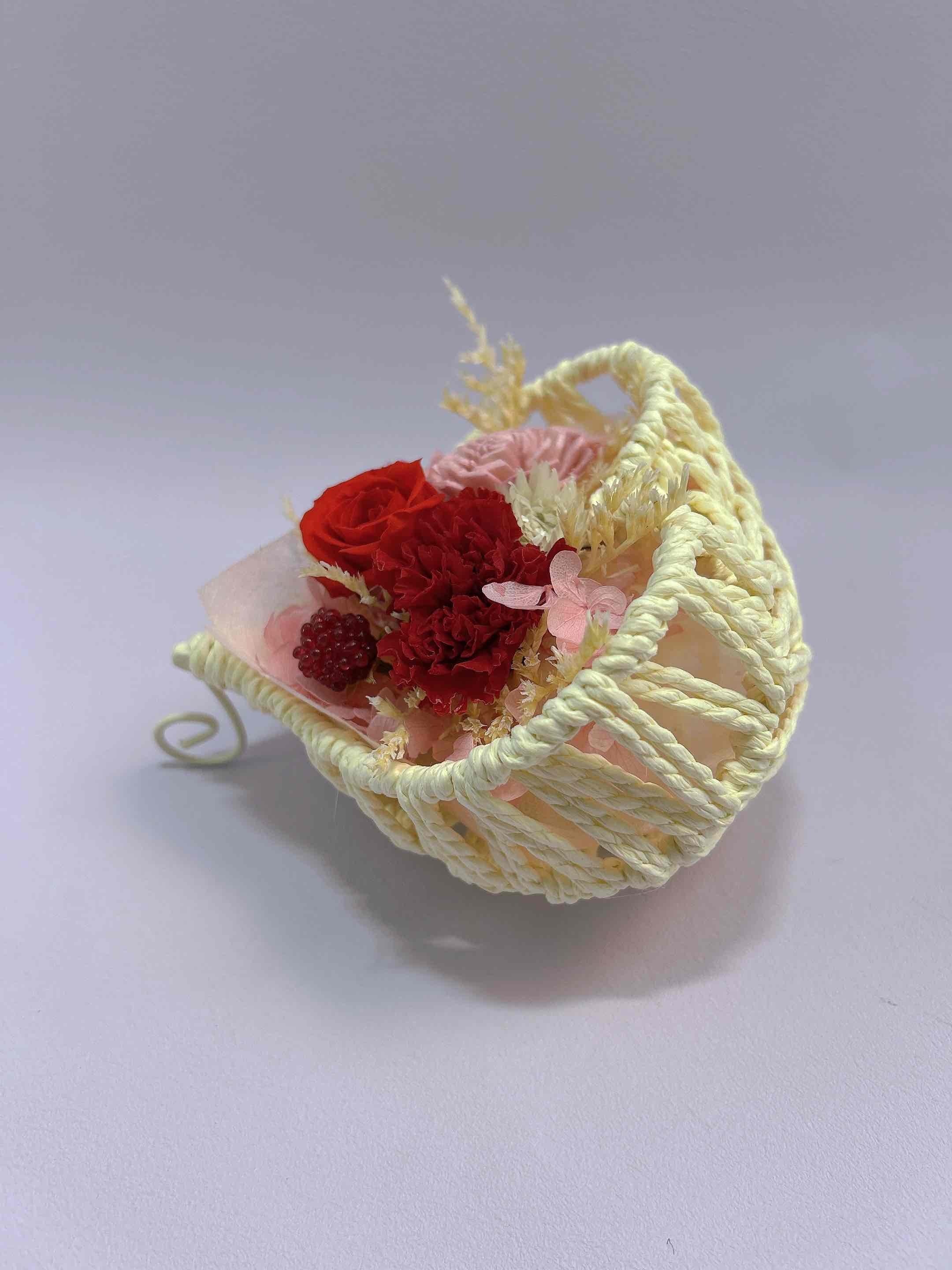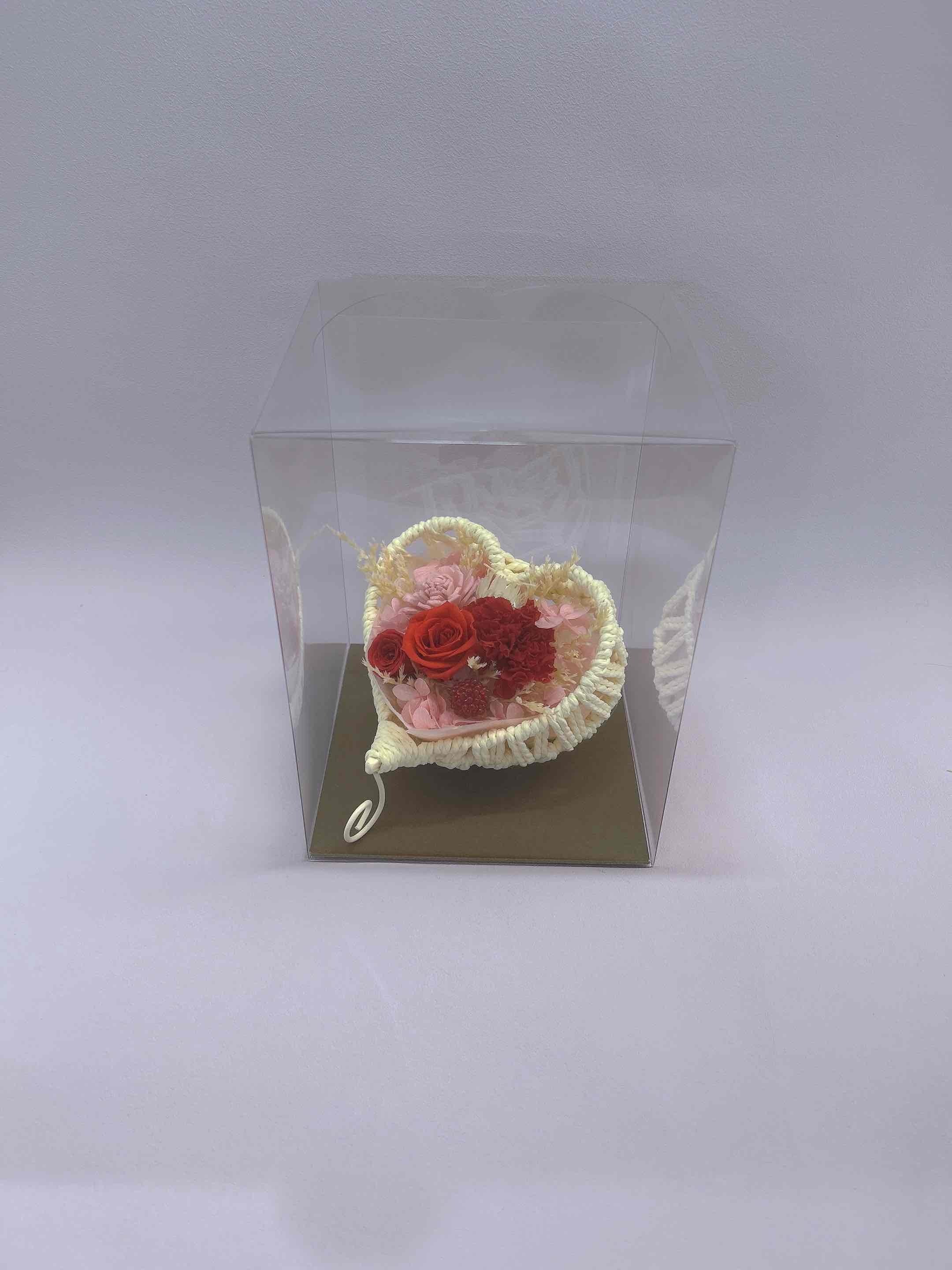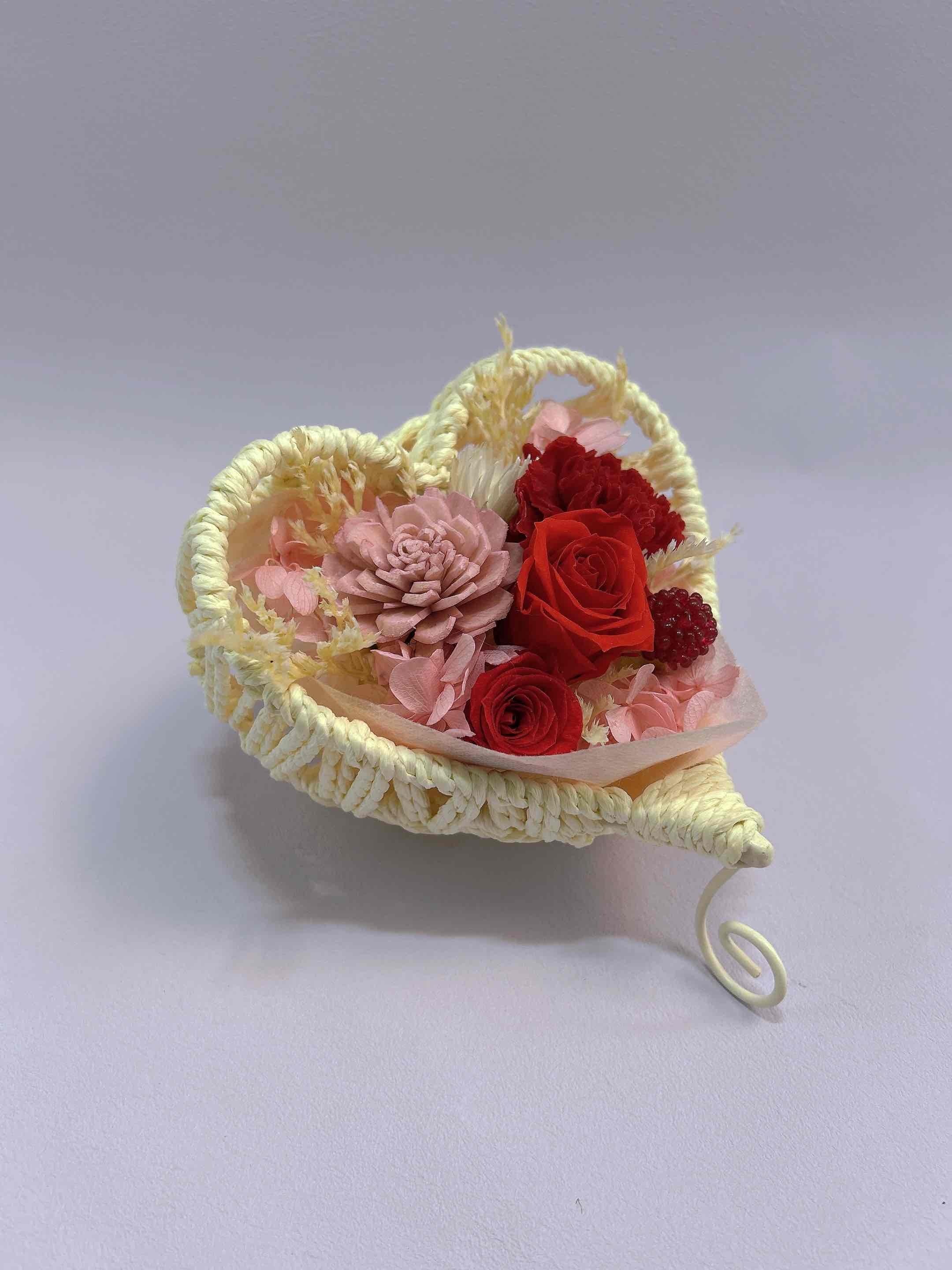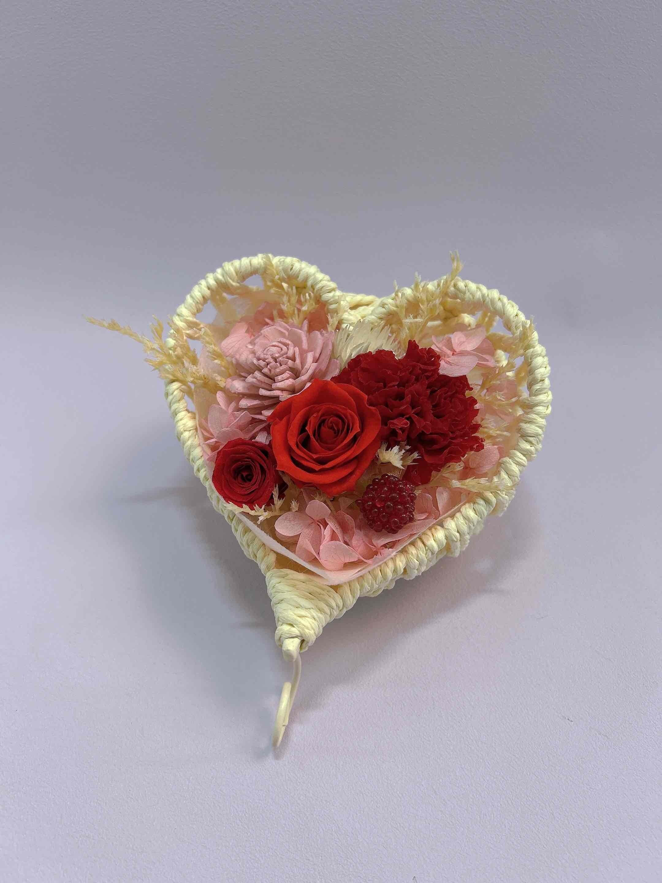ハート型の器に入った、可愛らしいプリザーブドフラワーのアレンジメント。